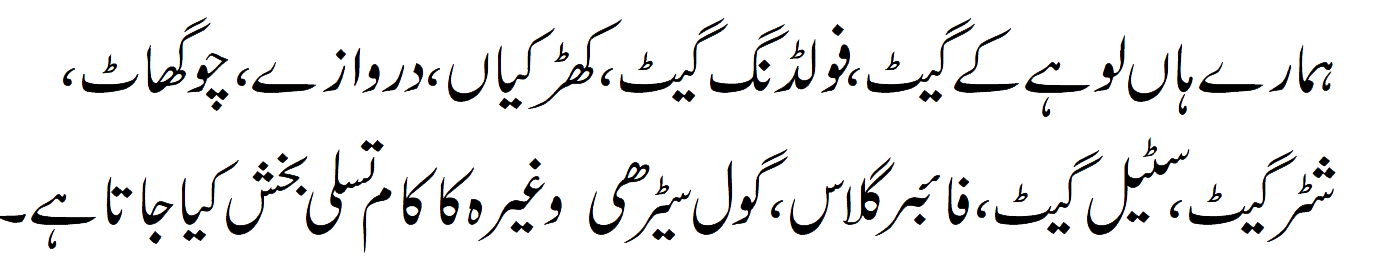 We are experienced in Iron Gate, folding gate, windows, doors, door chokhat, shutter gate, SS steel gate, Fiberglass, round stairs, grills, fences, school iron furniture and much more in Lahore, Punjab and across Pakistan.